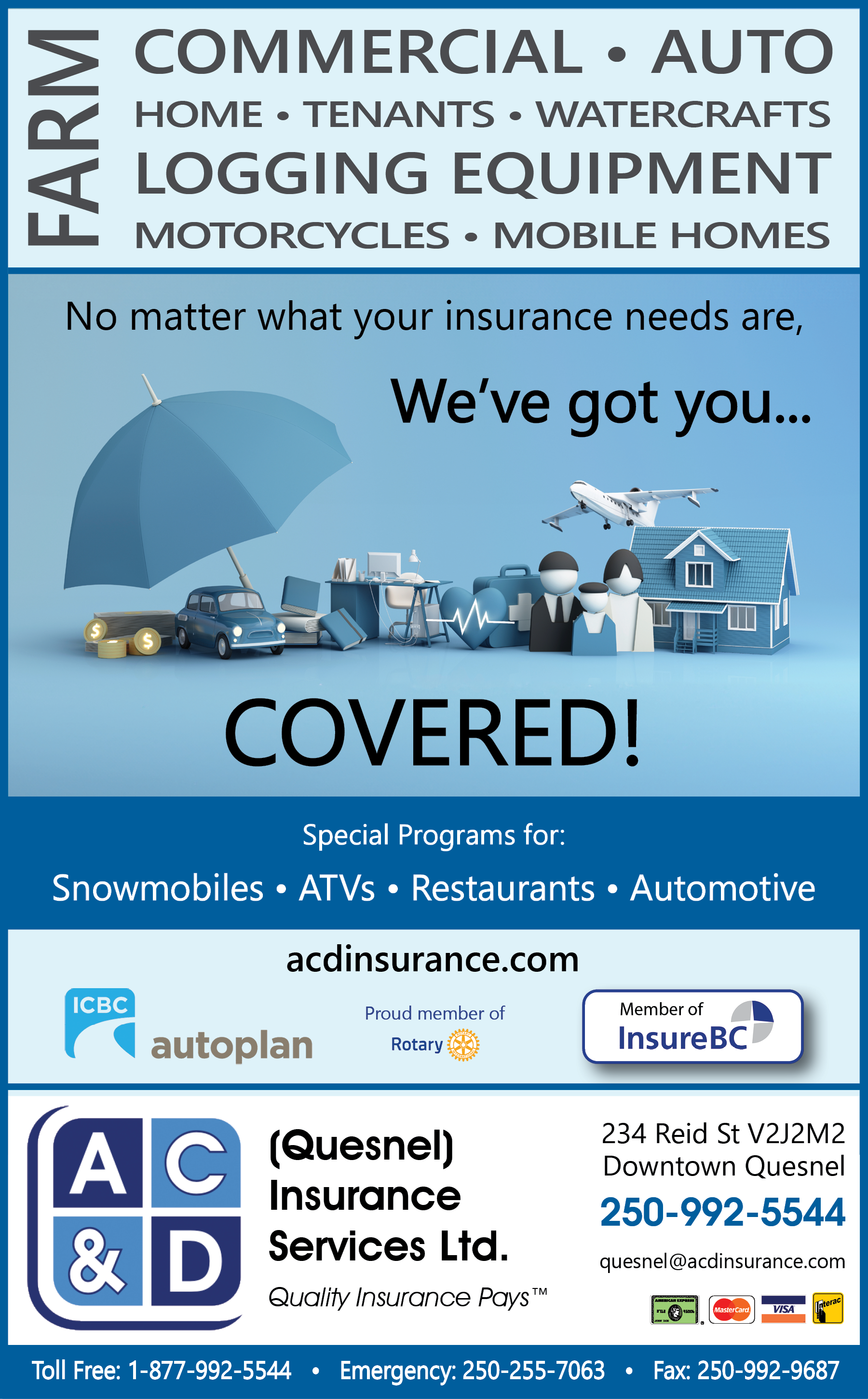 If you are looking for a one-stop insurance broker that is connected to your community, then visit or call AC&D Insurance Services in Quesnel – and don't be surprised if the first thing they say to you is, "We've got you...COVERED!"