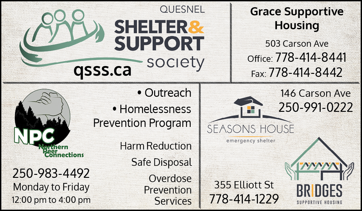 #QuesnelShelterSupportSociety #HomeShelterin Quesnel #QuesnelHomeless #QuesnelHomelessPrevention #QSSS #QuesnelNaloxoneKits #QuesnelShelter #QuesnelSupport #QuesnelHarmReduction #QuesnelSeasonsHouse #QuesnelBridges #QuesnelHomelessnessPreventionProgram #QuesnelLowIncomeHousing #QuesnelCleanTeam #QuesnelSupportiveWorkers #QuesnelPeerConnections #QuesnelHousingFirst #QuesnelSupportiveHousing #QuesnelCommunityOutreach