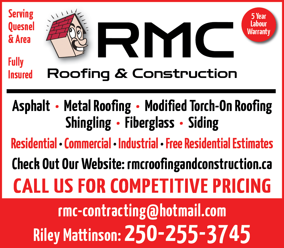 When you need a roof completed on time and professionally in the Quesnel area, a call to RMC Contracting is in order. Their work speaks for itself, and you can depend on RMC Contracting to do the job correctly. RMC Contracting offers a full lineup of asphalt shingle roofing, metal roofing, modified torch-on-roofing, shingling, siding, and fibreglass shingles.